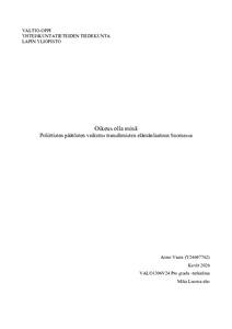 (Lapin yliopisto, 2026)Tutkielmani tarkastelee vuoden 2023 translain uudistuksen vaikutuksia transihmisten elämänlaatuun Suomessa. Uudistus siirsi juridisen sukupuolen vahvistamisen yksilön omaan ilmoitukseen ja poisti lääketieteelliset edellytykset, ... -