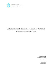 (Lapin yliopisto, 2025)Tässä pro gradu -tutkielmassa tarkastellaan perusoikeuksien – julkisuusperiaatteen ja yksityis-elämän suojan – välistä dynamiikkaa korkeimman hallinto-oikeuden (KHO) ratkaisukäytännössä. Tutkimuksen tarkoituksena on ...Rajattu käyttöoikeus. Käytettävissä vain Lapin yliopiston kirjaston asiakaskoneilla. -