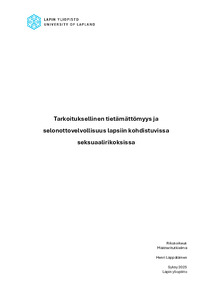 (Lapin yliopisto, 2025)Lapin yliopisto Tiedekunta: Oikeustieteellinen tiedekunta Työn nimi: Tarkoituksellinen tietämättömyys ja selonottovelvollisuus lapsiin kohdistuvissa seksuaalirikoksissa Tekijä: Henri Lappalainen Opetuskokonaisuus ja ... -