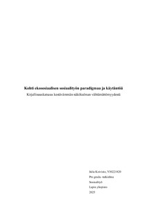 (Lapin yliopisto, 2025)Tutkimuksessa tarkasteltiin ekososiaalisen sosiaalityön paradigmaa sekä käytäntöä. Tavoitteena oli muodostaa yleiskuva ekososiaalisesta paradigmasta, jonka kehittyminen on vielä kesken. Kiinnostus tutkimustehtävässä ... -
