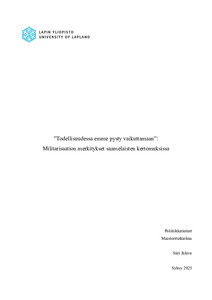 Tutkimuksen aineistona käytän viidestä haastattelusta muodostuvaa haastatteluaineistoa. Teoreettisena viitekehyksenä hyödynnän kriittistä militarismitutkimusta ja metodina puolestaan kriittistä diskurssianalyysiä. Aineistosta olen näiden välineiden avulla havainnut kolme erilaista puhetapaa, joita kutsun turvattomuus-, ulkopuolisuus- ja myötämielisyysdiskurssiksi.Turvattomuusdiskurssissa militarisaatio ja asevoimat kuvautuvat turvallisuuden sijaan turvattomuutta tuottaviksi tekijöiksi. Tämä on diskursseista voimakkain ja ilmentää asuttajakolonialistista eliminoinnin logiikkaa. Ulkopuolisuusdiskurssissa kuvataan saamelaisiin kohdistuvaa systemaattista ulossulkemista heitä itseään koskevasta päätöksenteosta. Myötämielisyysdiskurssissa puolestaan osoitetaan kiitollisuutta, ymmärrystä ja tukea asevoimille sekä Suomen päätöksille liittoutua sotilaallisesti.